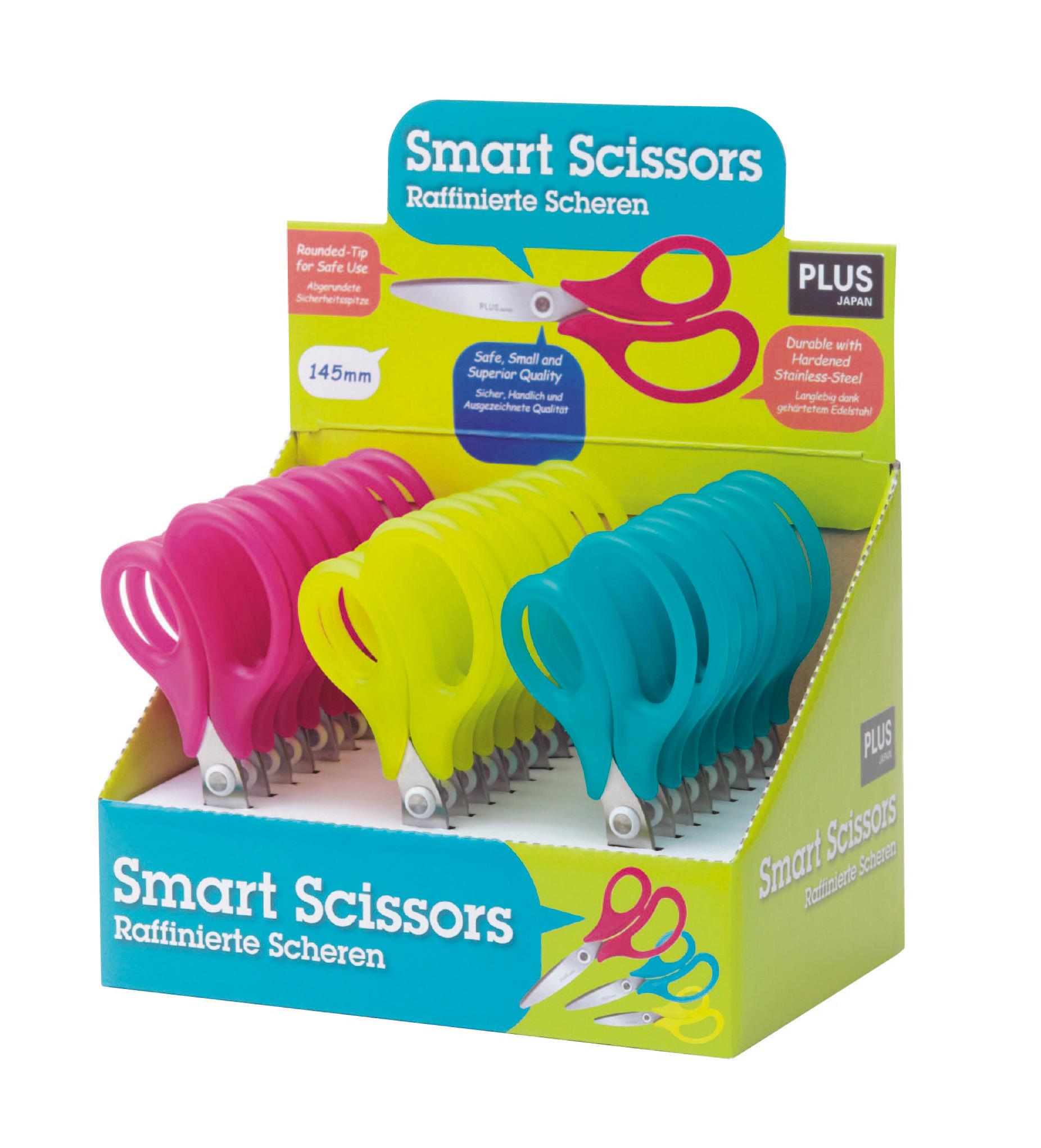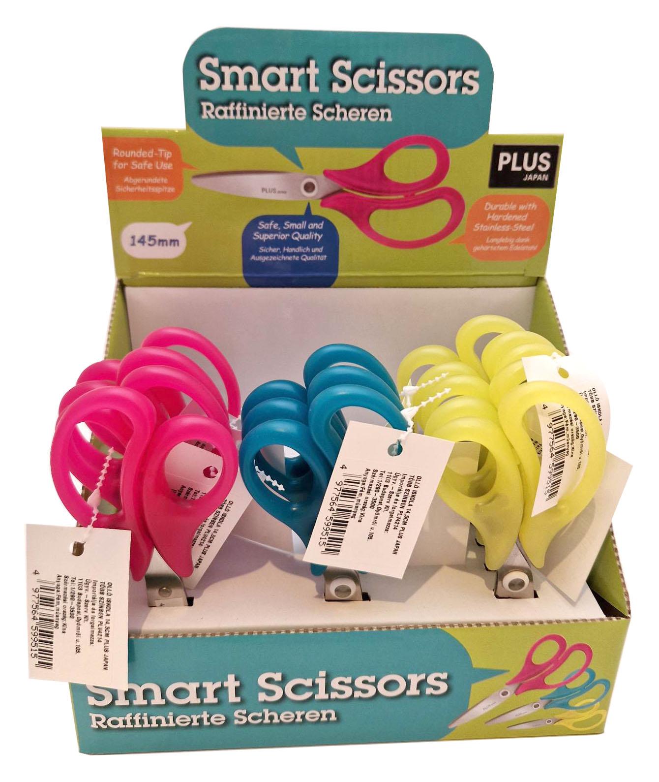 PLUS JAPAN ISKOLAI OLLÓ- 14.5 CM - SÁRGA, RÓZSASZIN ÉS KÉK SZÍNBEN - lekerekített hegy - csúszásmentes soft fogórész - DISPLAY dobozban szállítjuk